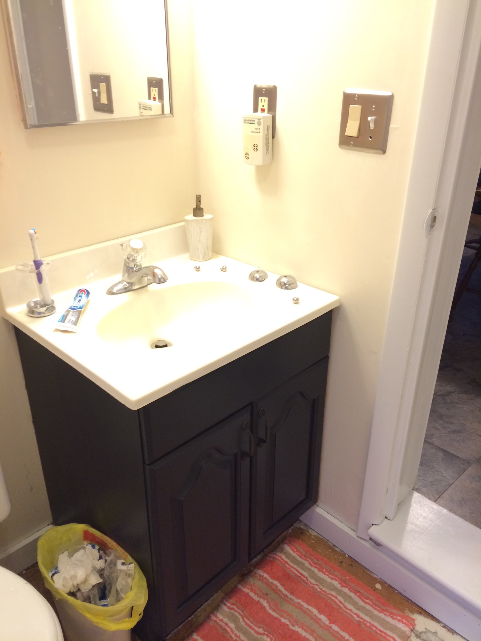 My dad so kindly changed out the light fixture and it’s one less liability. The oak-ish vanity cabinet, was dullsville and bothered me. If this house production has taught me anything, it’s paint is a miracle worker. We had a Small container of black paint for the down stairs bathroom and I decided to give it a whirl upstairs. I’m really glad I did! The new cabinet looks much more modern now. Here it is fresh and new: