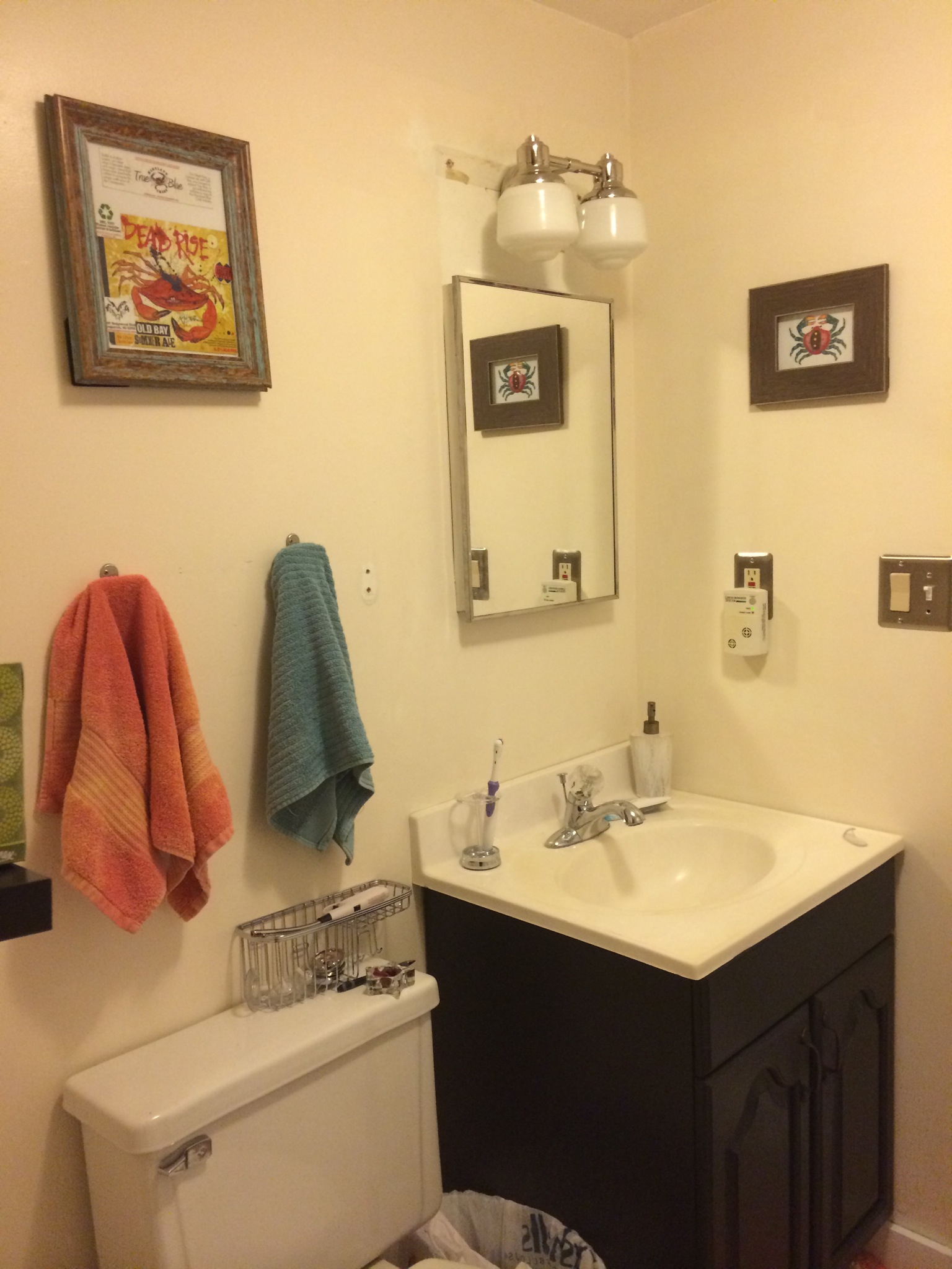 Over all, I think operation: crabby bathroom went off quite well. Here is the full vanity completed and decorated: