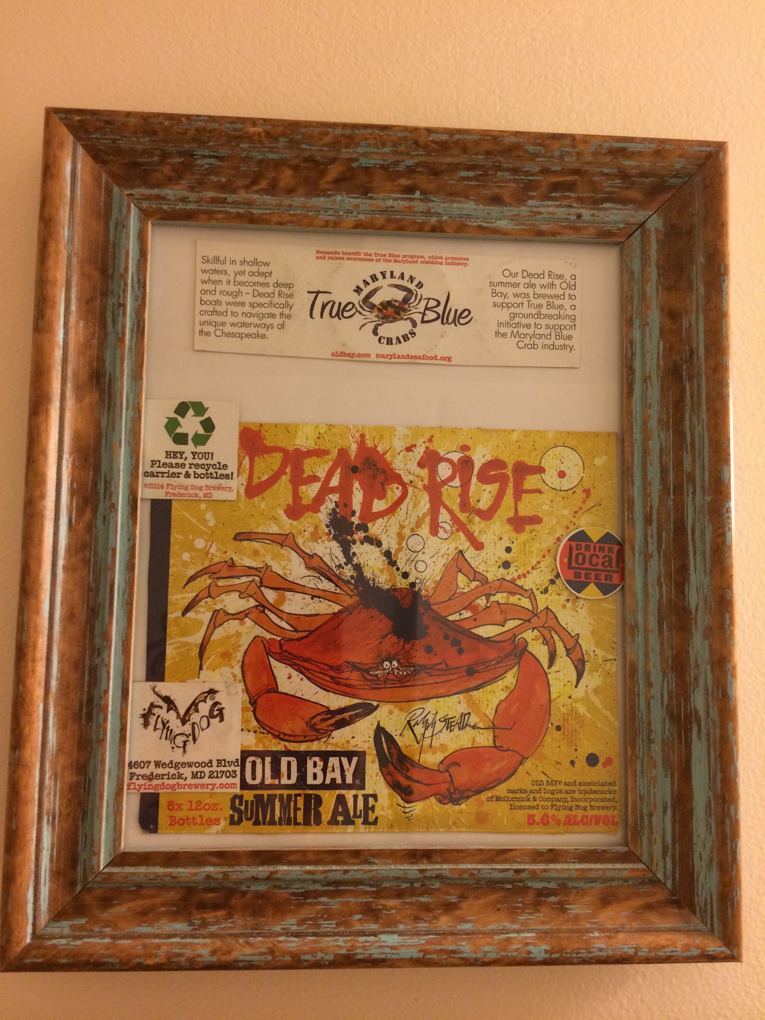 A few years ago my parents brought me cute crab magnets from an adventure down South. Since then I’ve moved about 3 times and they haven’t all made it out alive. Today I had a stroke of genius when I decided to frame one that I found. The magnet was lost about 2 moves ago, so I had to rip it apart a bit to make it work. However, I think it turned out pretty cute for some art work: