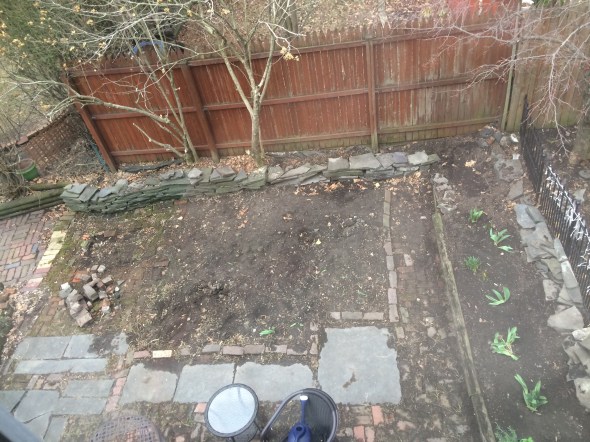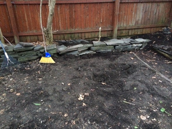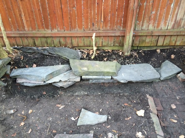 It was a pleasant surprise to see some flowers popping up in the middle. However, they were in an inconvenient space. You can see against the back there is a missing piece of the slate wall. As I started to investigate, I found that under the leaves and dirt was actually the base of what was a brick wall. Once I started digging, I just couldn’t stop and ended up doing this