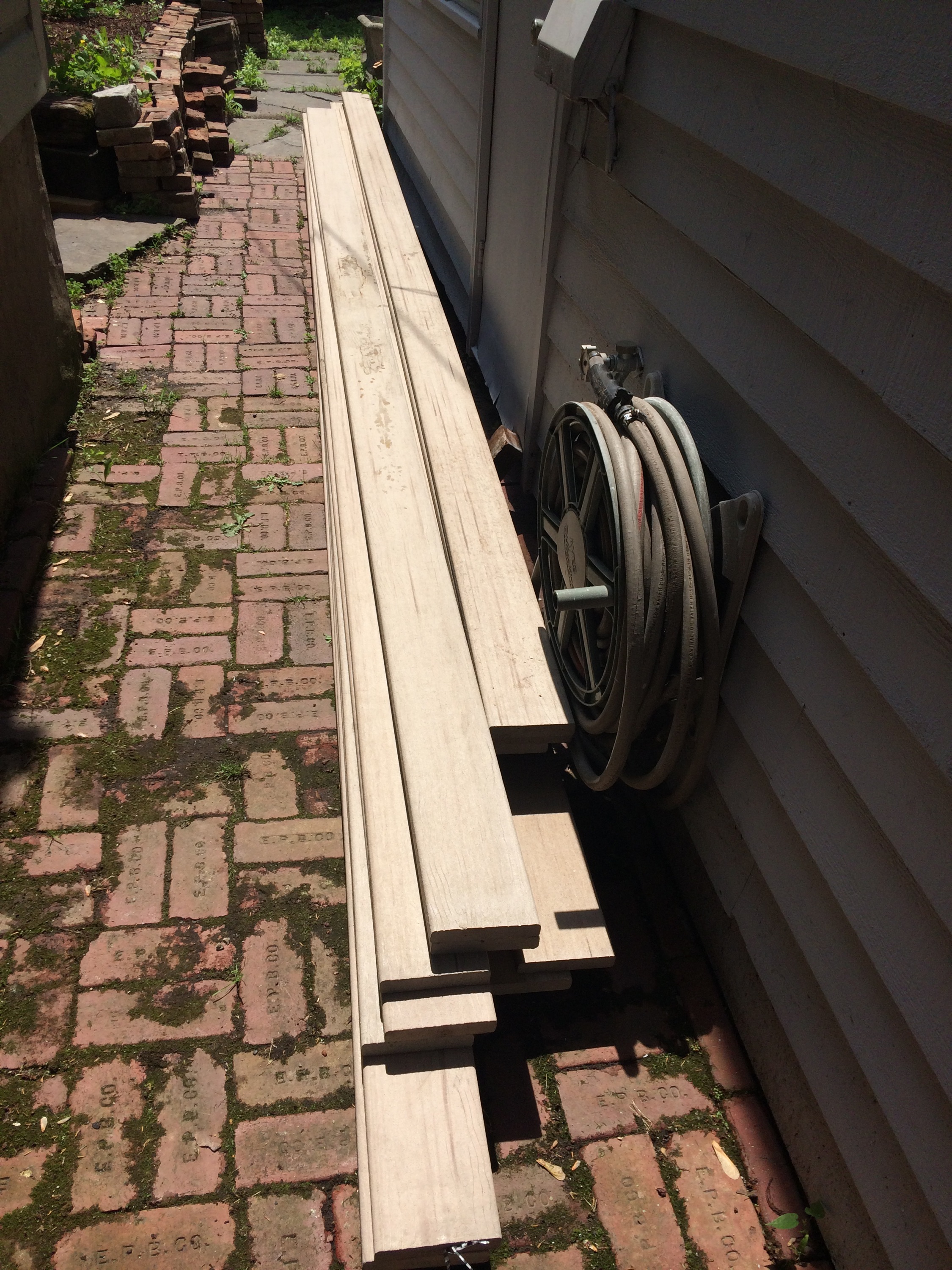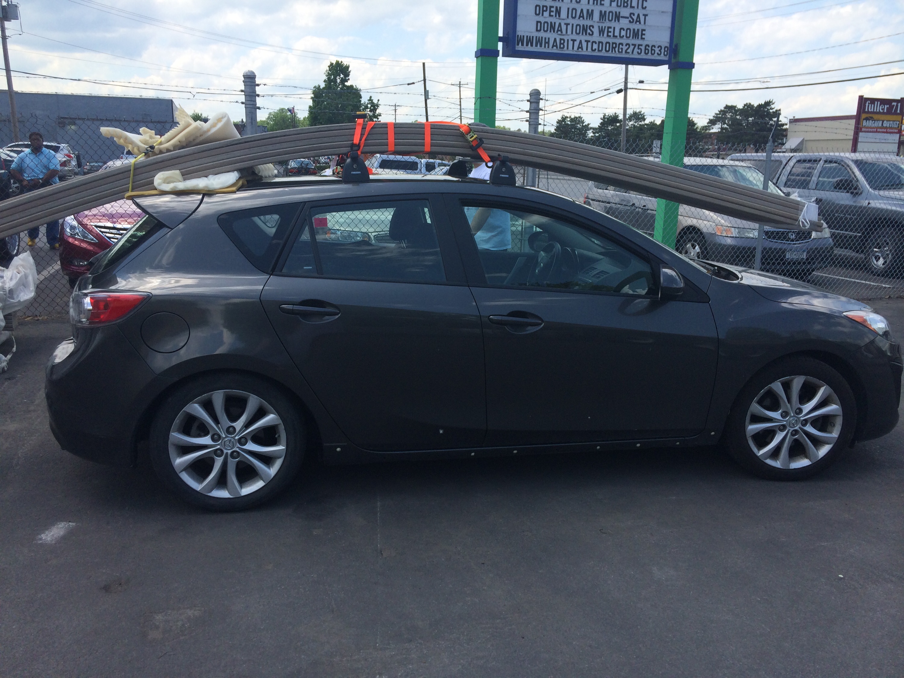 For ease, I used 16ft pieces of the decking as my yard is 18 ft wide. How did I get 20 pieces of 16 foot decking home? Why the top of my brother’s Mazda hatchback of course! A truck would’ve been helpful, but, you work with what you can get. And all I could get was 1 bearded brother, 2 helpful Habitat volunteers, and 2 hours of running out of work to get this done. It was really tied on well and we drove slow, no worries folks.