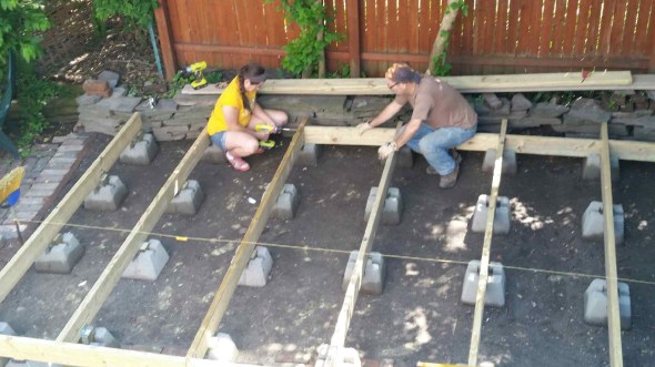 Once everything is laid out, you need to make a frame with pressure treated wood as you would any deck. Here’s all the wood I schlepped in being guarded by Oreo:
